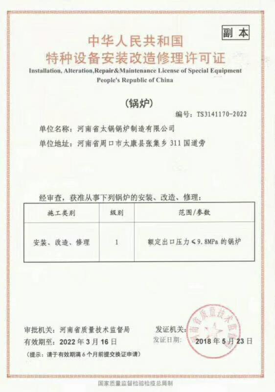 A級鍋爐制造許可證
